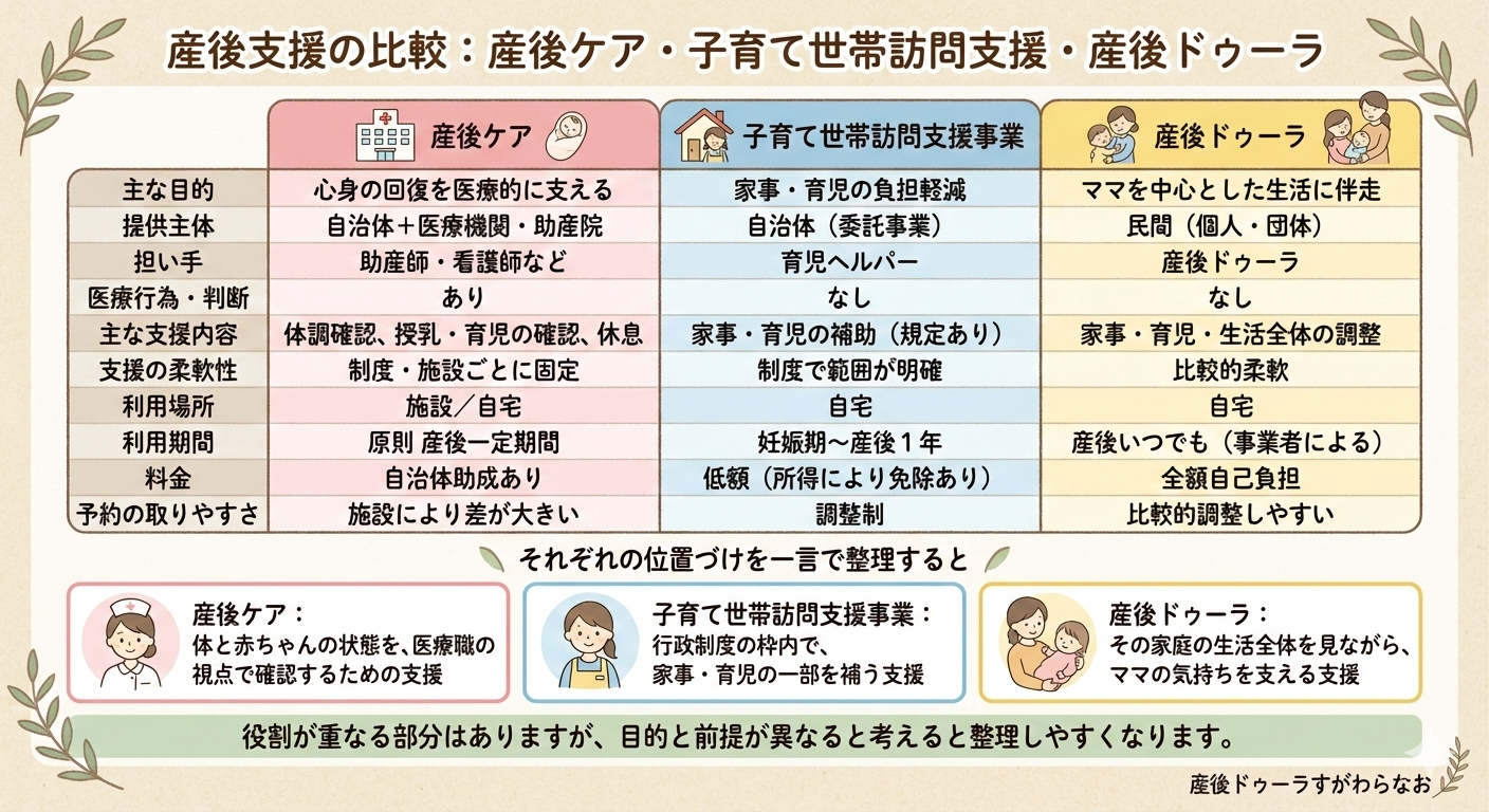 どちらも産後の家庭を支えるための仕組みです。